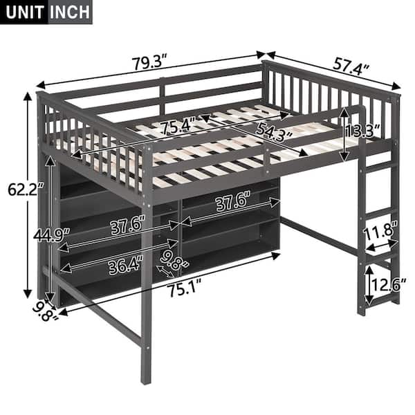 Gray Full Size Wood Loft Bed with 8 Open Storage Shelves
