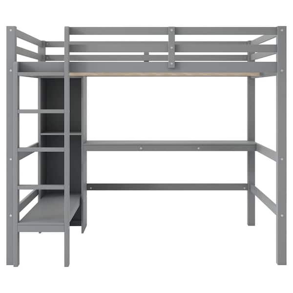 Gray Full Size Wood Loft Bed with Multifunction Shelves and Under-Bed Desk