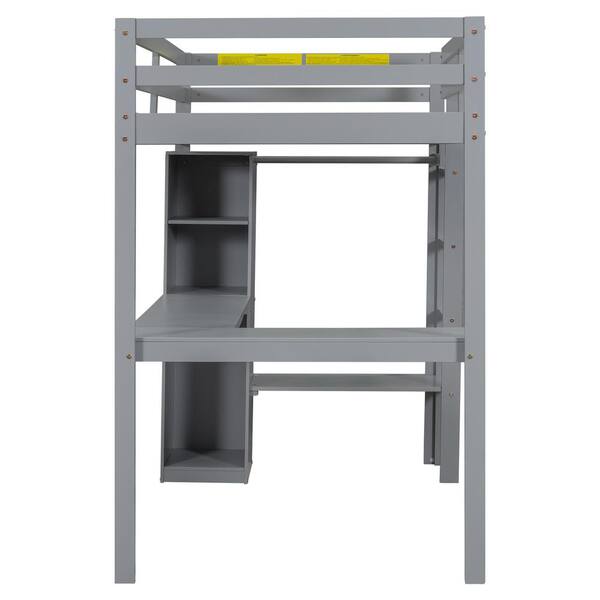 Gray Twin Size Loft Bed with L-shaped Desk, Wardrobe and Shelves