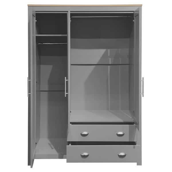 Gray Wood 47.2 in. Wardrobe with 3-Doors, 2-Drawers, and 2-Hanging Rods