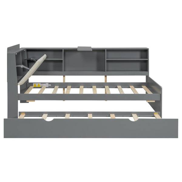 Gray Wood Frame Twin Size Platform Bed with Trundle and Rotatable Storage Board
