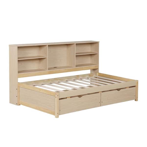 Natural Twin Size Daybed with Side Bookshelves and Built-in USB Port
