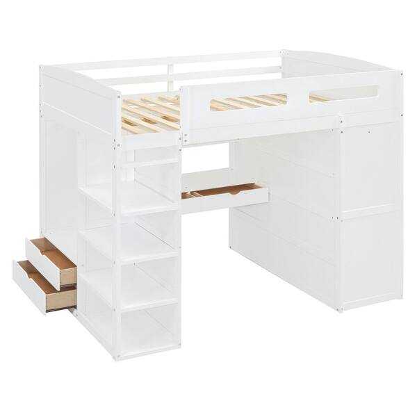 White Full Size Loft Bed with Wardrobes, Desk, 4 Drawers and 4 Shelves