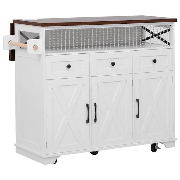 White Wood 46.5 in. Rolling Kitchen Island with Drop Leaf, Power Outlet and 5-Wheels