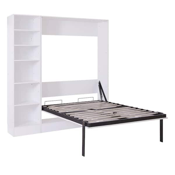 White Wood Frame Full Murphy Bed with Sofa and Shelves
