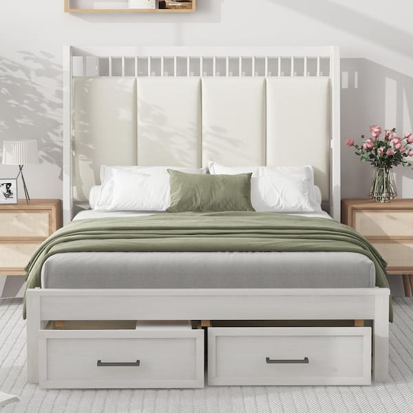 White Wood Frame Full Platform Bed with Upholstered Headboard and 2-Drawers
