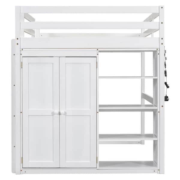 White Wood Frame Full Size Loft Bed with Wardrobe, LED Light and Storage Shelves