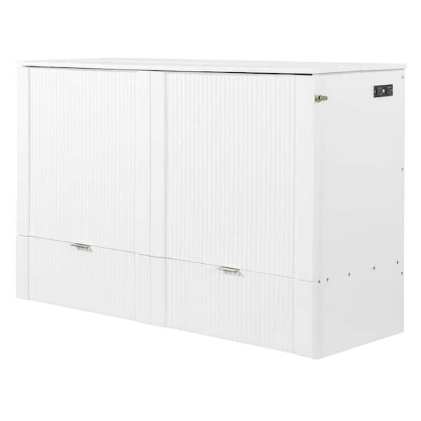 White Wood Frame Queen Murphy Bed with Sockets and USB Ports
