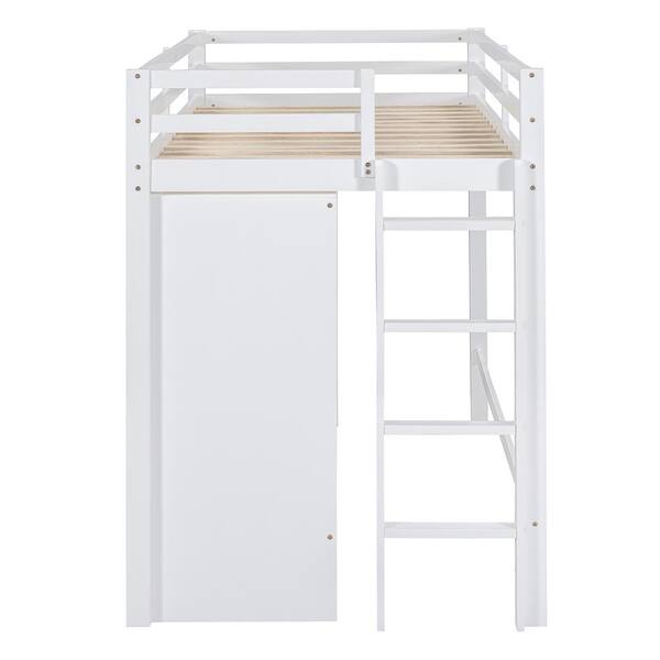 White Wood Frame Twin size Loft Bed with Drawer, 2 Wardrobes and Mirror