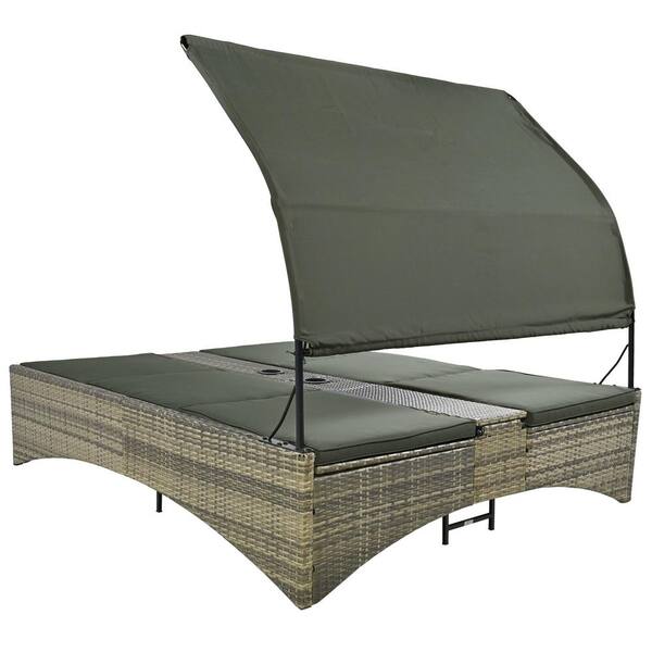 Wicker Outdoor Day Bed with Shelter Roof, Adjustable Backrest, Storage, 2 Cup Holders and Gray Cushions