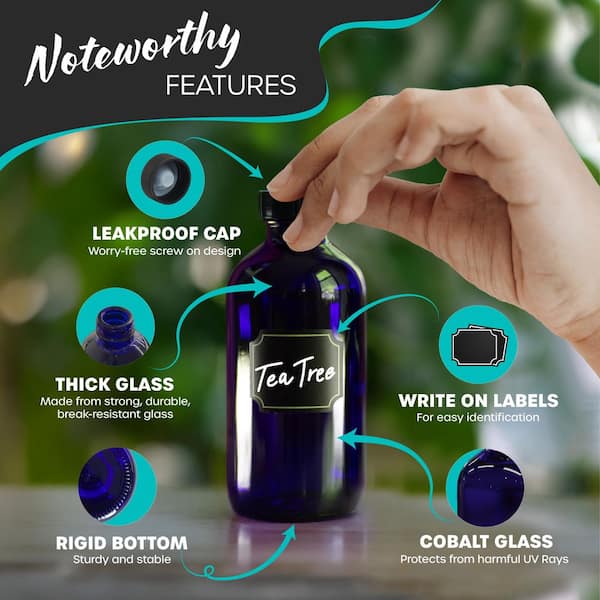 • Thick blue glass blocks harmful UV rays to keep contents fresh.