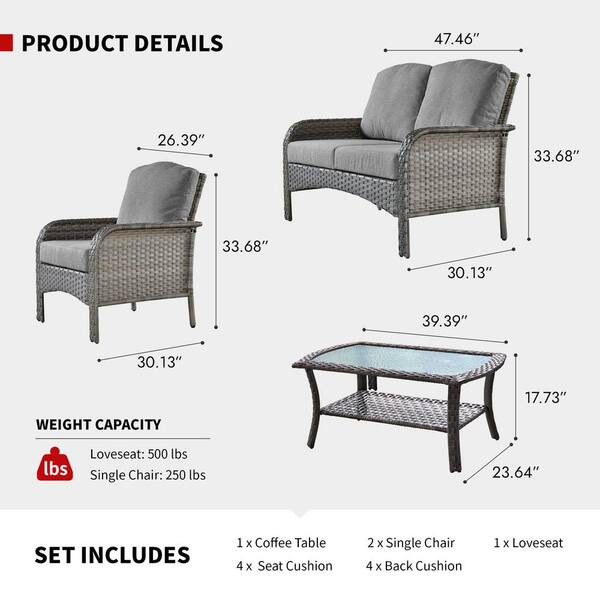 New Hyacinth Gray 4-Piece Wicker Patio Outdoor Conversation Seating Set with a Coffee Table and Dark Gray Cushions