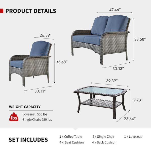 New Hyacinth Gray 4-Piece Wicker Patio Outdoor Conversation Seating Set with a Coffee Table and Denim Blue Cushions