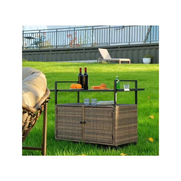New Light Brown Series 360° Rolling Wicker Serving Cart, Outdoor Bar Counter Table, Glass Top for Garden Poolside Party