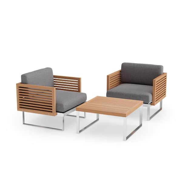 Monterey 3 Piece Stainless Steel Teak Outdoor Patio Conversation Set with Cast Slate Cushions and Coffee Table