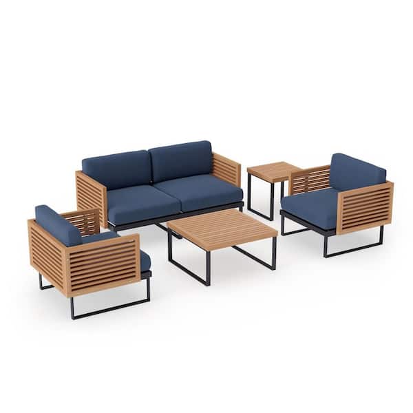 Monterey 4-Seater 5-Piece Aluminum Teak Outdoor Patio Conversation Set With Spectrum Indigo Cushions