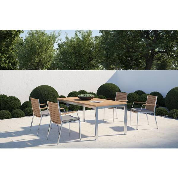 Monterey 5 Piece Stainless Steel Teak Outdoor Patio Dining Set in Spectrum Indigo Cushions with 72 in. Table