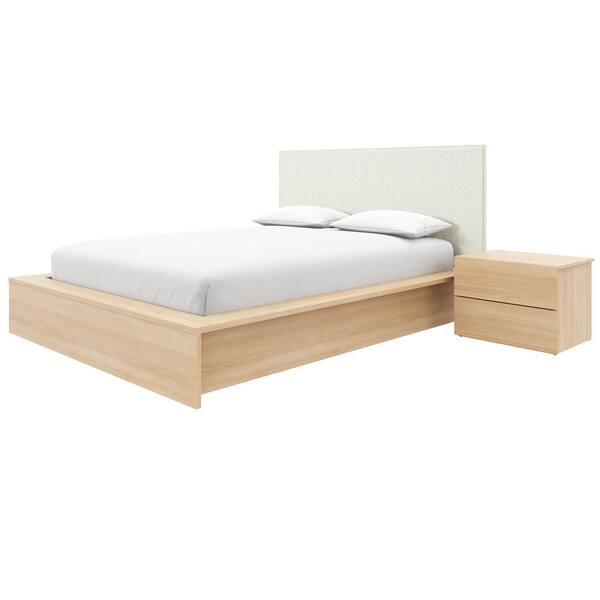 Bardot 3-Piece Natural Blonde Oak Wood Queen Size Bedroom Set with Gray Upholstered Headboard