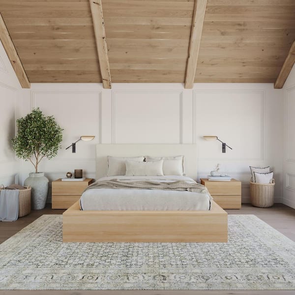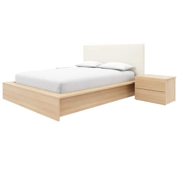 Jane 4-Piece Natural Blonde Oak Wood Queen Size Bedroom Set with Upholstered Headboard