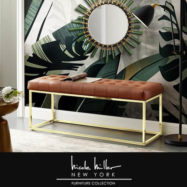 Koa Camel Brown/Gold PU Leather Bench with Button Tufted Metal Frame