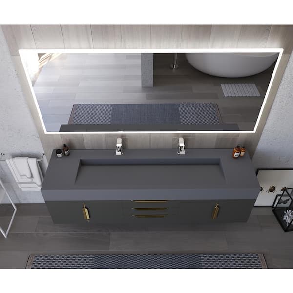 Nile 72 in. W x 19 in. D x 20 in. H Bath Vanity in Matte Black with Gold Trim and Gray Solid Surface Top