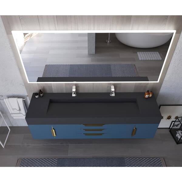 Nile 72 in. W. x 19 in. D x 20 in. H Single Bath Vanity in Matte Blue with Gold Trim and Black Solid Surface Top