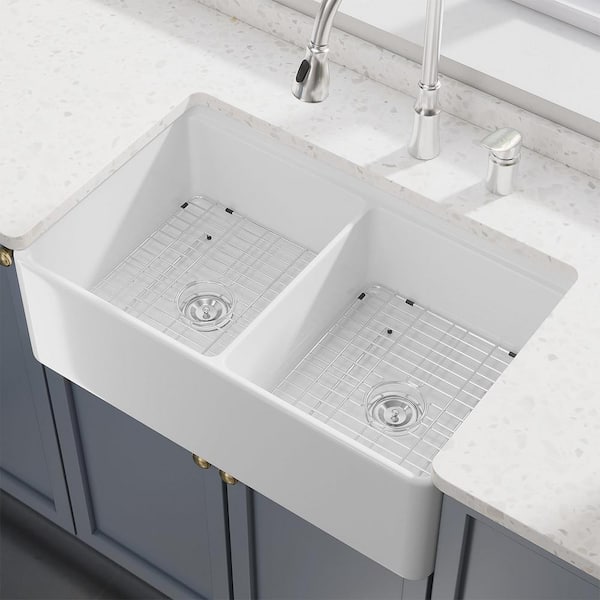 33 in. Farmhouse/Apron-Front Double Bowl White Ceramic Kitchen Sink with Accessories