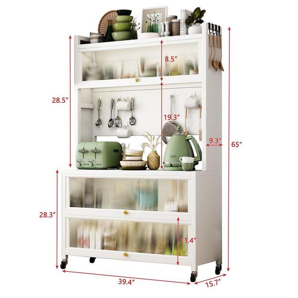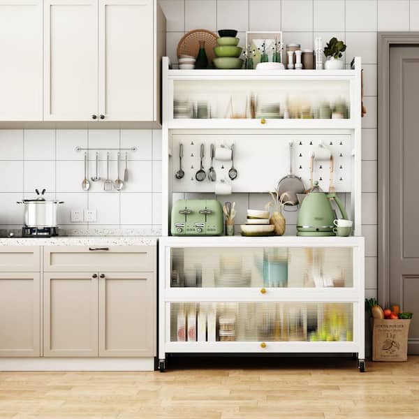 5-Shelf White Metal Pantry Organizer with 3 Fluted Barn Doors and 4 Universal Wheels