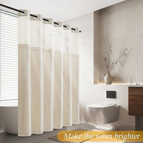 No Hooks Linen Textured Shower Curtain with Snap-in Liner Set 72x75 in Beige Decor with See Through Top Window Cream
