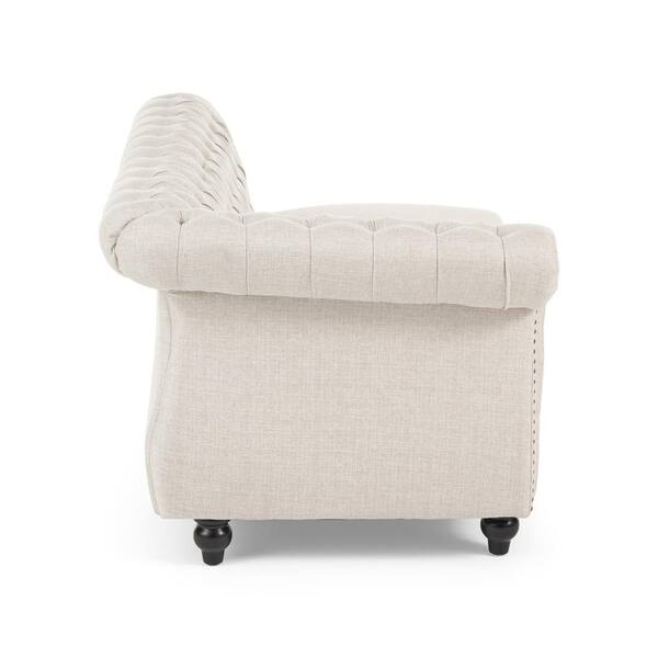 • Made with beige polyester with dark brown birch legs