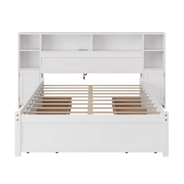 Belinda White Wood Frame Full Size Platform Bed with Storage Headboard, 6 Drawers, Charging Station, Shelves