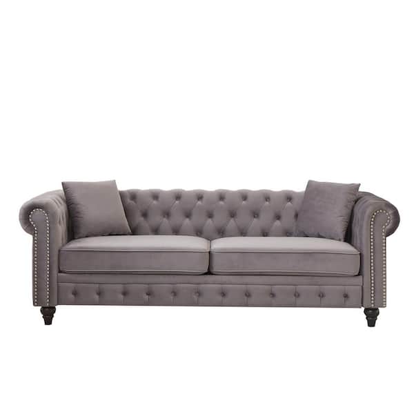Beryl 85.5 in. Rolled Arm Velvet Upholstered Rectangle Tufted Chesterfield Sofa in Grey with Pillows, Nailhead Trim
