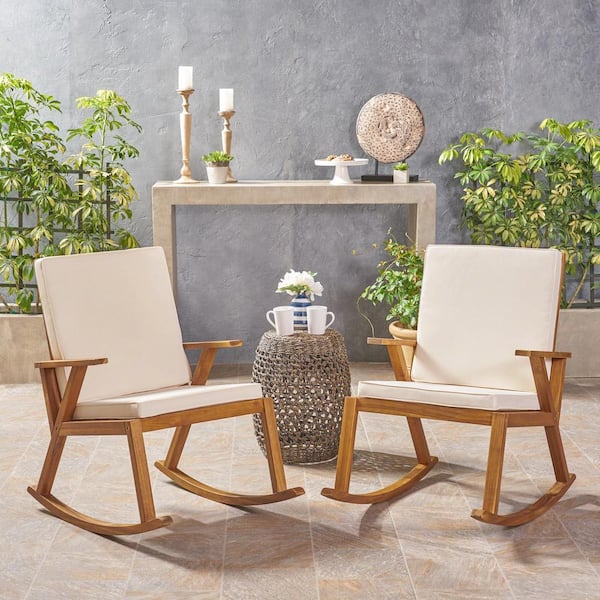 Champlain Teak Brown Wood Patio Outdoor Rocking Chairs with Cream Cushions (2-Pack)