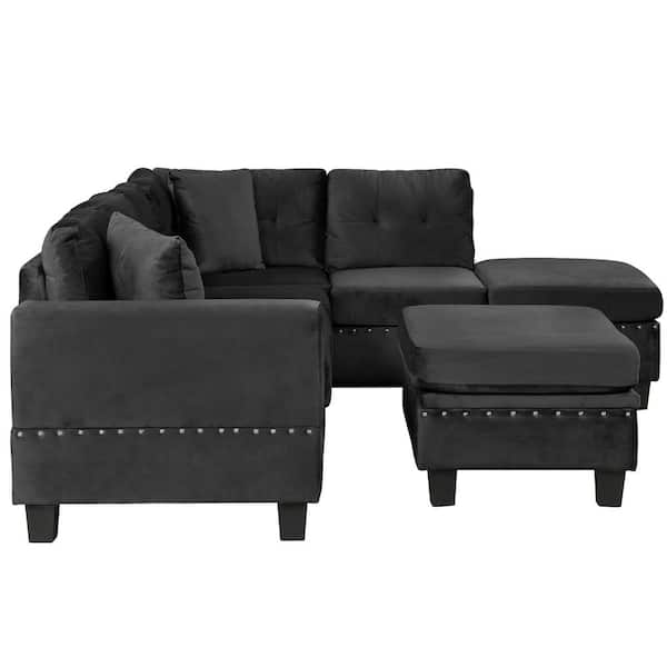 Cheerful 105.1 in. Velvet Upholstered L Shape Sectional Sofa in Black with Storage Ottoman, 2 Pillows, Cup Holders