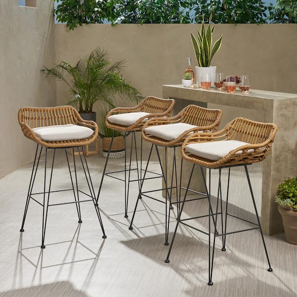 Dale 38 in. Light Brown Outdoor Patio Bar Stool with Beige Cushions (Set of 4)