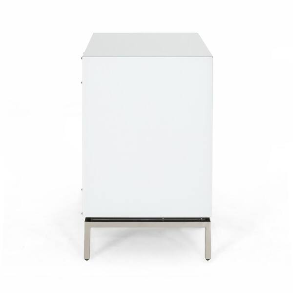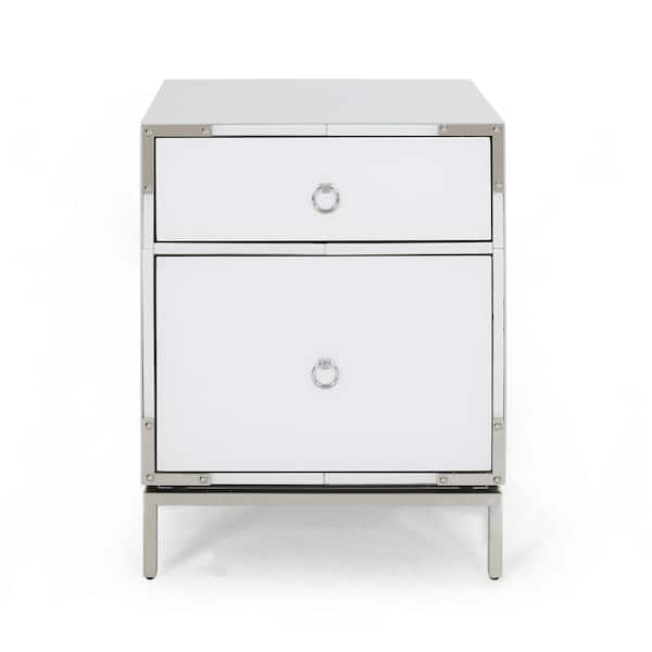 Daphney White Glass 2-Drawer Bedside Table with Silver Stainless Steel Frame
