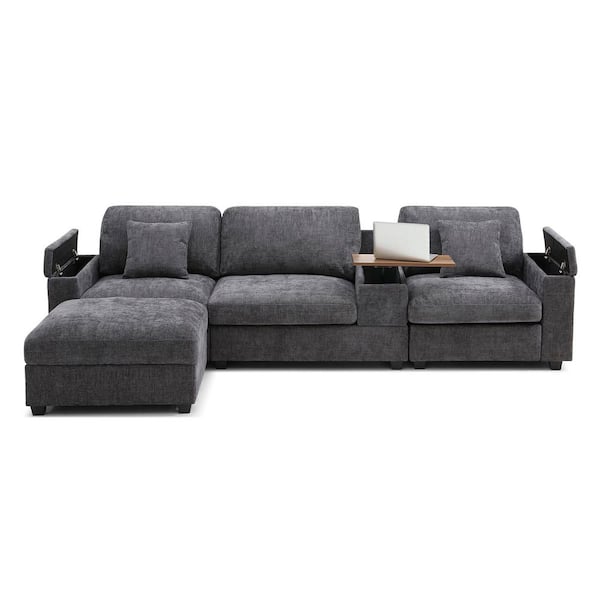 Eile 120.3 in. Linen Rectangle Sectional Sofa in. Grey with 360 Swivel Tray, Cup Holders, USB Charger, Ottoman, Armrest