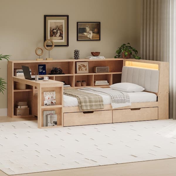 Jed Beige Full Size L-Shaped Daybed with Upholstered Hidden Storage Headboard, Desk, Shelves, LED Light, Drawers,Natural