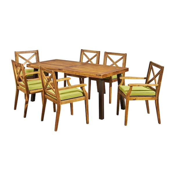 Juniper Teak Brown 7-Piece Wood and Metal Outdoor Dining Set with Green Cushions