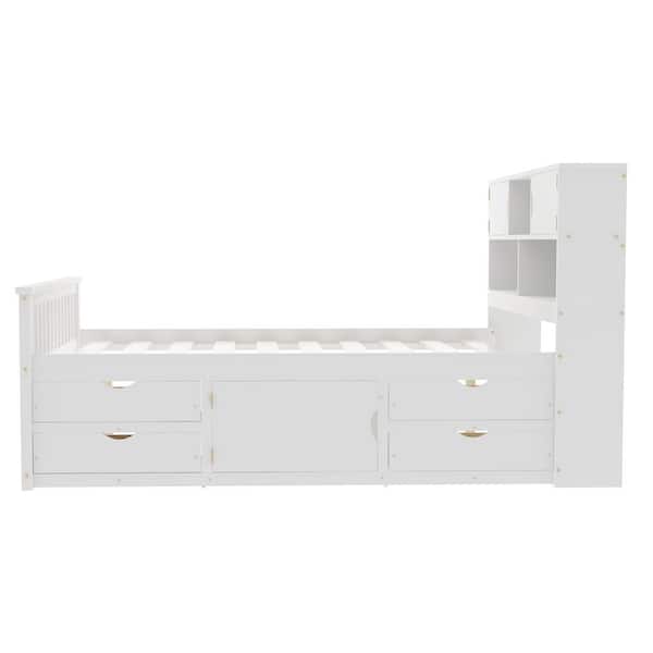 Kara White Wood Frame Full Size Captain Platform Bed with Storage Headboard, Bookcases, Shelves, 4-Drawers, Footboard