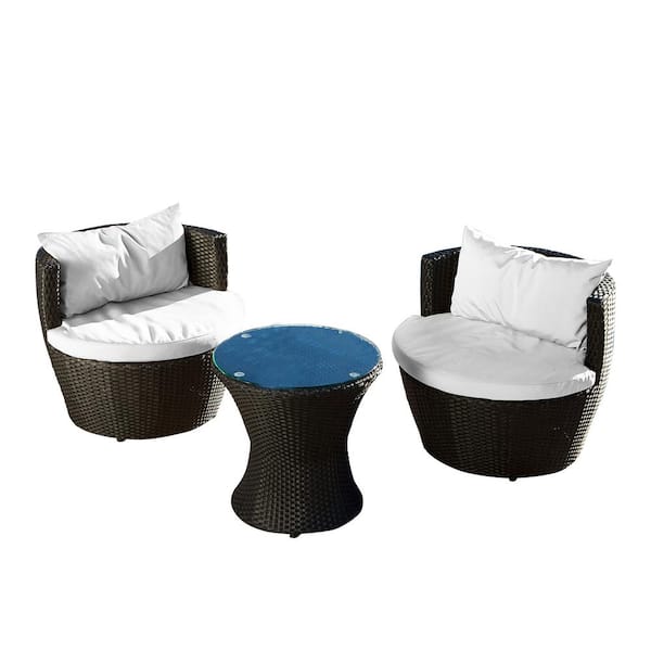 Kono Black 3-Piece Faux Rattan Outdoor Patio Conversation Set with White Cushions