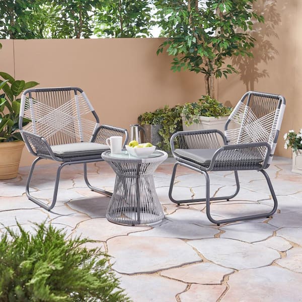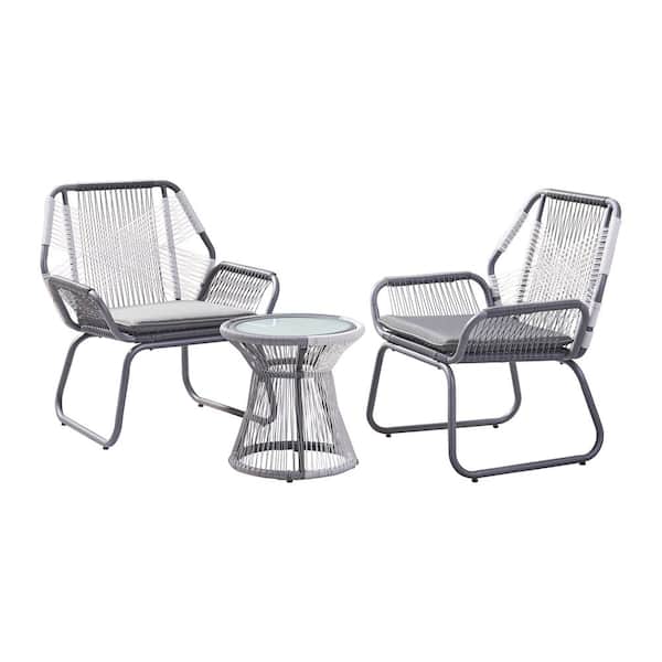 Milan Gray and White 3-Piece Faux Rattan and Metal Patio Conversation Set with Gray Cushions
