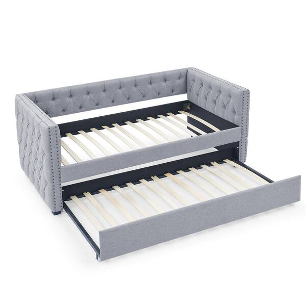 Timsa Grey Twin Size Modern Upholstered Daybed with Trundle, Button Tufting, Nailhead Trim