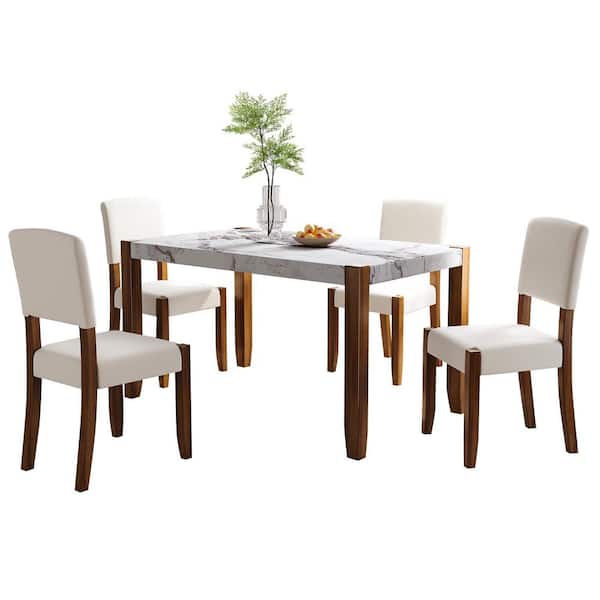 Valoria 5-Piece Off White and Brown Modern Dining Set, Marble Table Design, Upholstered Seats