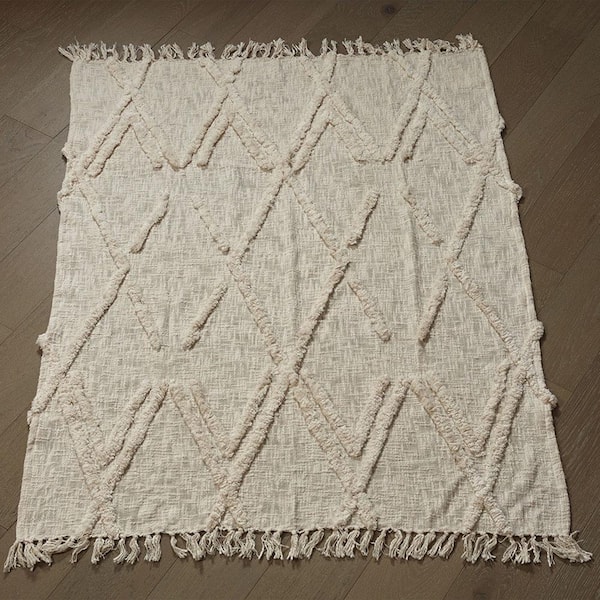 Norah Handmade Beige Boho Farmhouse Sofa Bed All Natural Cotton Throw Blanket with Fringe