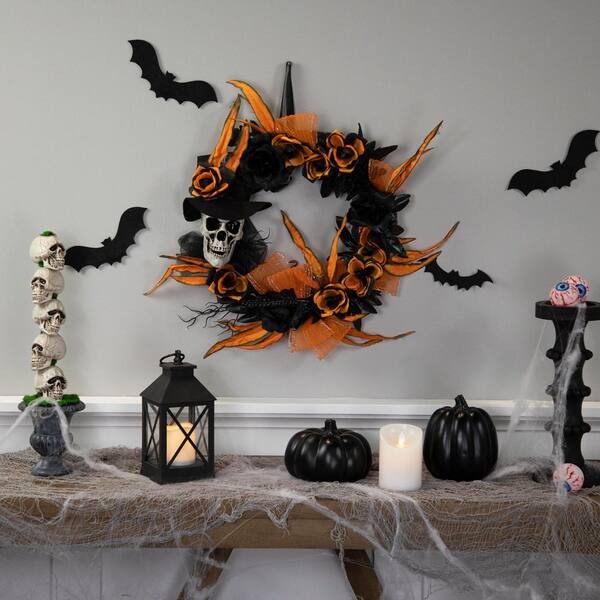 • Skull wreath with black and orange roses add a Halloween charm