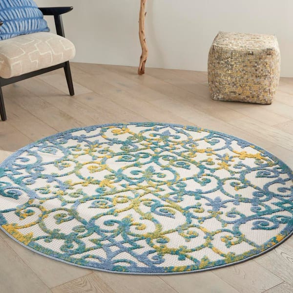 Aloha Ivory Blue 5 ft. Round Floral Contemporary Indoor/Outdoor Patio Area Rug