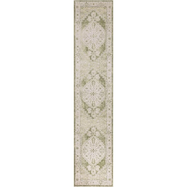 Astra Machine Washable Ivory Green 2 ft. x 8 ft. Center medallion Traditional Runner Area Rug