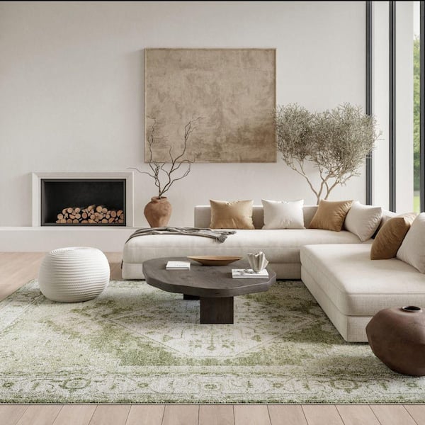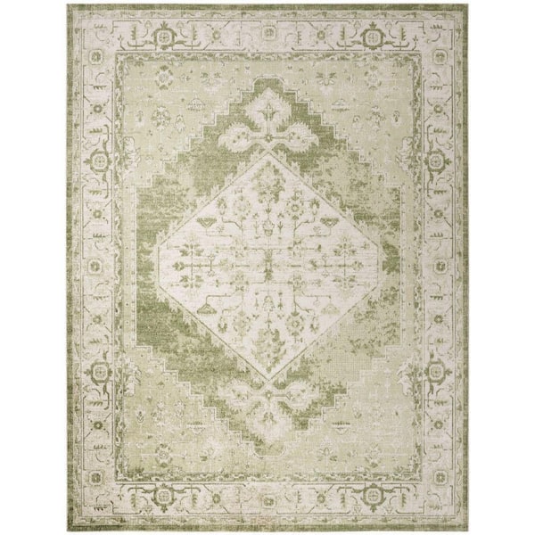 Astra Machine Washable Ivory Green 7 ft. x 9 ft. Center medallion Traditional Area Rug
