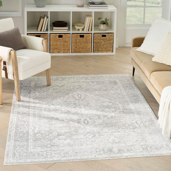 Astra Machine Washable Light Grey 5 ft. x 7 ft. Center medallion Traditional Area Rug